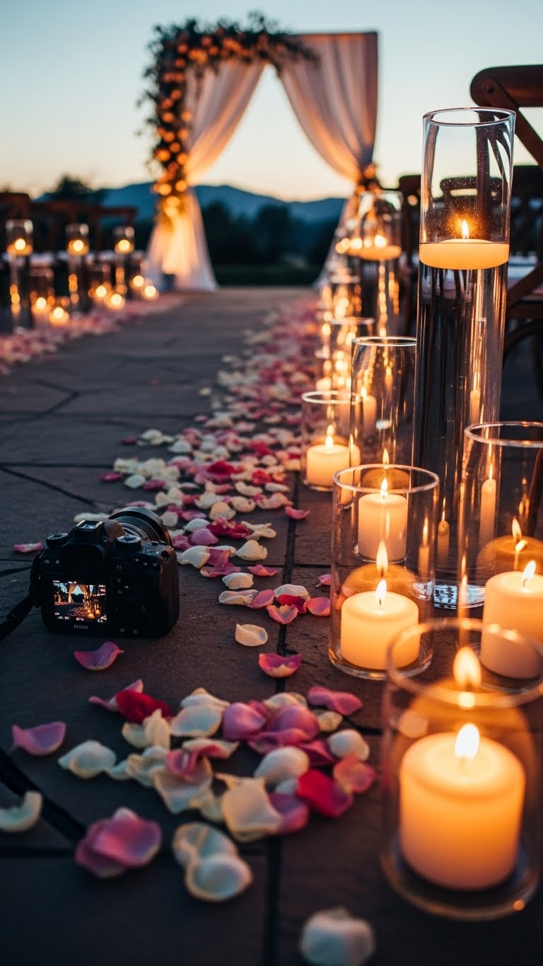 Picture lining your ceremony path with candles for a show-stopping effect. Start simple: Grab affordable pillar candles from a dollar store and place them in mismatched jars you already own. Arrange them along the aisle in groups of three, varying heights for added depth. This creates a welcoming glow that draws eyes and sets a romantic tone. For a DIY twist, wrap twine around the jars and add dried leaves from your yard for a natural look. Keep costs low by reusing items from past events—think old vases or thrift shop finds. Break it down: Measure your aisle first, space candles every two feet, and light them just before guests arrive. This setup works indoors or out, adding drama without fancy tools. Experiment with battery-operated options for safety, especially in windy spots. You’ll love how it transforms the moment guests walk in.
