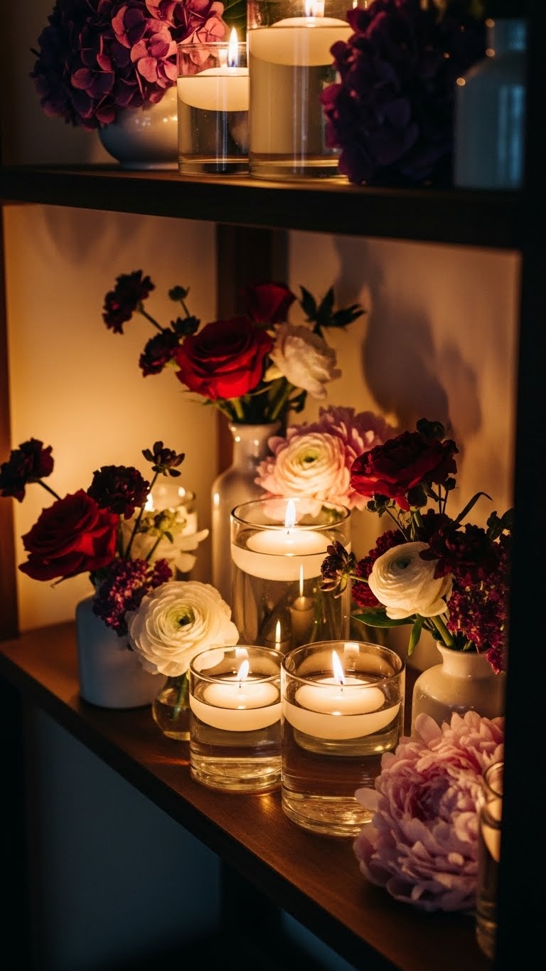 Float candles in vases to create eye-catching decor. Fill clear jars with water from the tap and add floating wicks from a dollar store. Place them on shelves or bars with flowers for contrast, making the setup pop. This adds a modern twist that’s simple to do. For DIY ideas, drop in petals from your garden to enhance the effect without buying extras. Set it up in minutes: Pour water, add candles, and light. Perfect for walls or counters, it brings life to empty spots. Go cheap by reusing vases and buying wicks in bulk. Watch how the gentle movement draws attention and sets a calm mood.