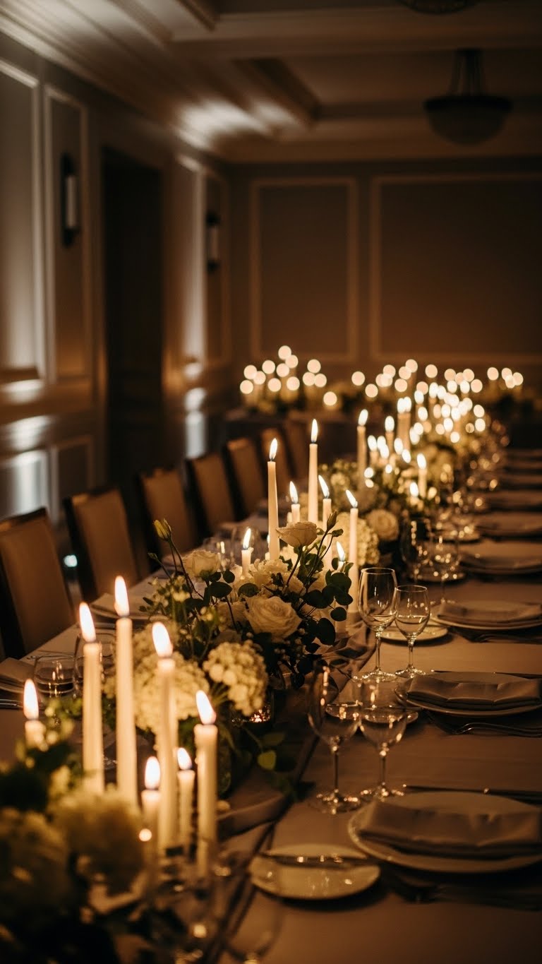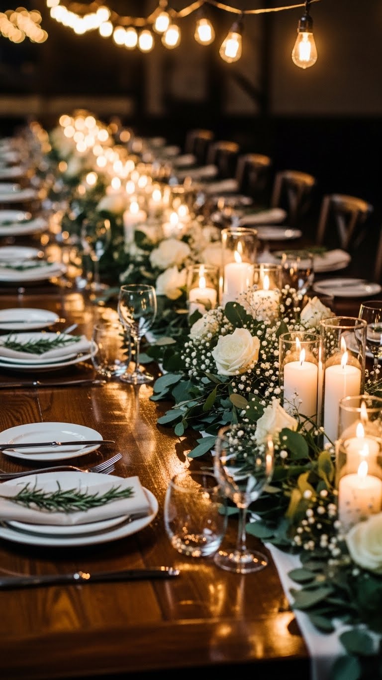 Use candles on long tables with florals for intimacy. Line them with simple flowers. This draws people together. For DIY, make runners from cloth. Arrange along: Add candles evenly. Perfect for events, it builds community. Save with home materials. Enjoy the interaction.