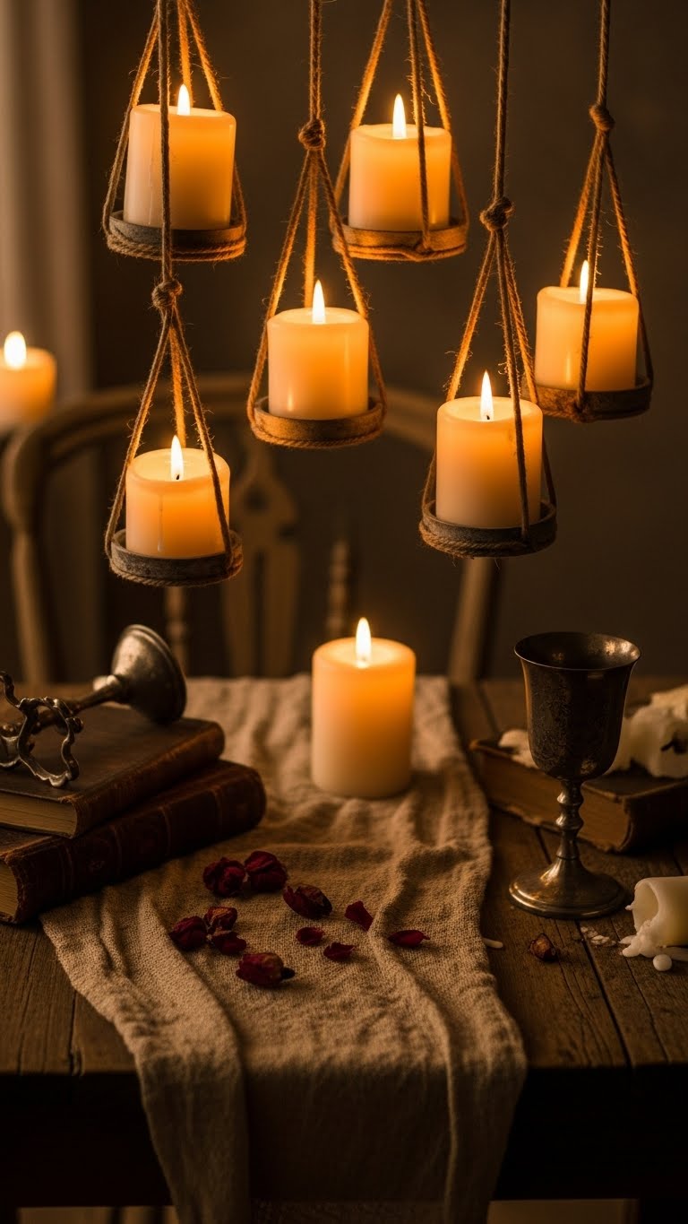 Suspend candles from a chandelier for an upscale feel. Use a basic hanging fixture from your attic and add candle holders with clips. Drape chains with tea lights for a shimmering look that doesn’t require much. This brings height and sparkle to any room. For a budget DIY, craft one from an old hoop and string; attach candles with wire from the garage. Hang it over your table and adjust for safety. Ideal for dinners, it adds a touch of elegance effortlessly. Shop thrift stores for parts to keep expenses down, and use battery candles to skip wiring hassles. Make it your own by varying the lengths for movement. See how it elevates the whole area.