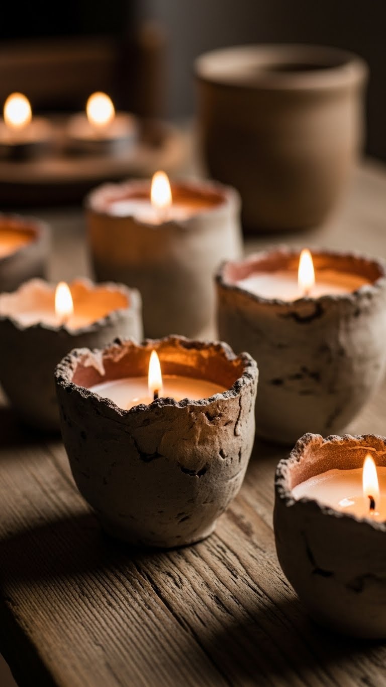Pair candles with raw materials like clay. Place in pots you find. This adds edge. For DIY, shape clay at home. Position simply: Highlight details. Works for setups, it grounds. Save with crafts. Feel the contrast.