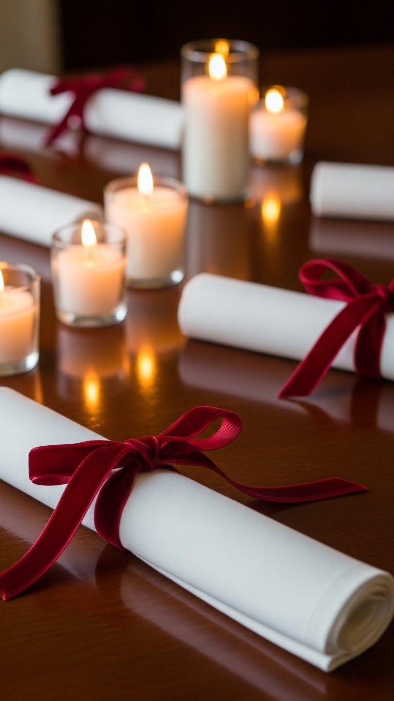 Use velvet on napkins with candles for accents. Cut ribbons from scraps and tie around. This finishes tables. For DIY, use fabric bits. Add to settings: Place near candles. Great for meals, it refines. Find cheap fabric. Notice the touch.
