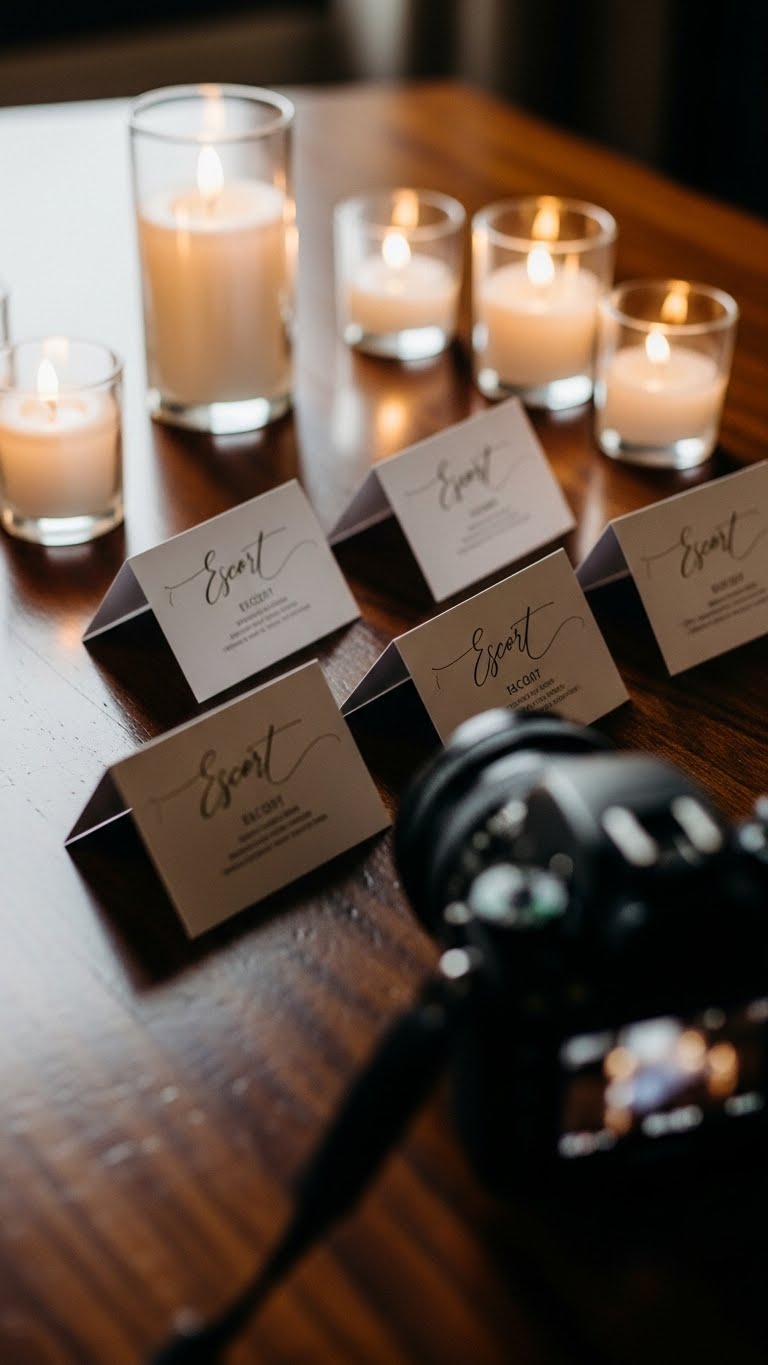 Place candles around escort cards to spotlight them. Use small ones nearby. This grabs attention. For DIY, make cards from paper. Set up: Circle with lights. Ideal for events, it guides. Use simple tools. See the draw.