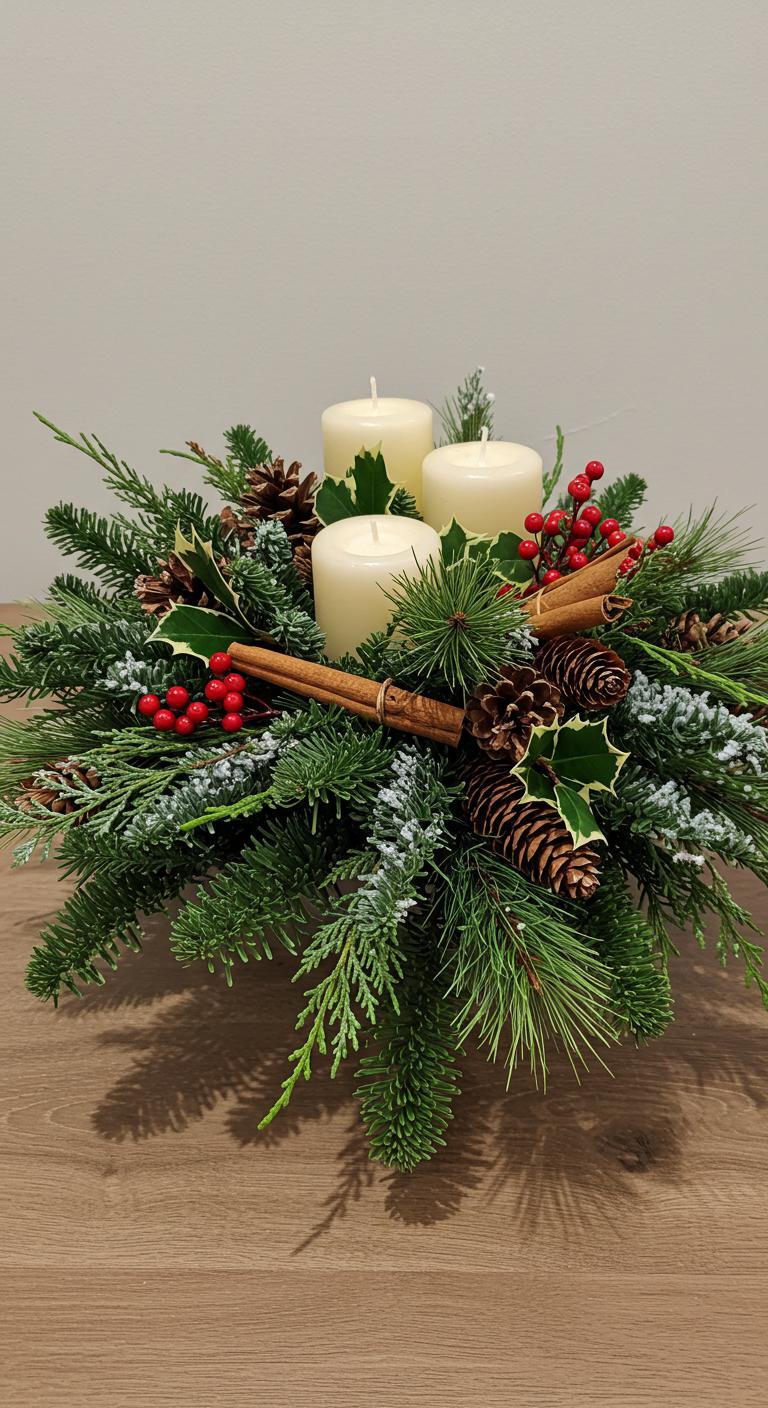 When you gather fragrant spruce boughs, glossy holly, and a handful of pine cones, you can craft a centerpiece that feels both timeless and warmly homespun; you’ll layer evergreen textures for contrast, tie stems loosely, and nestle varied pine cone varieties among candles.