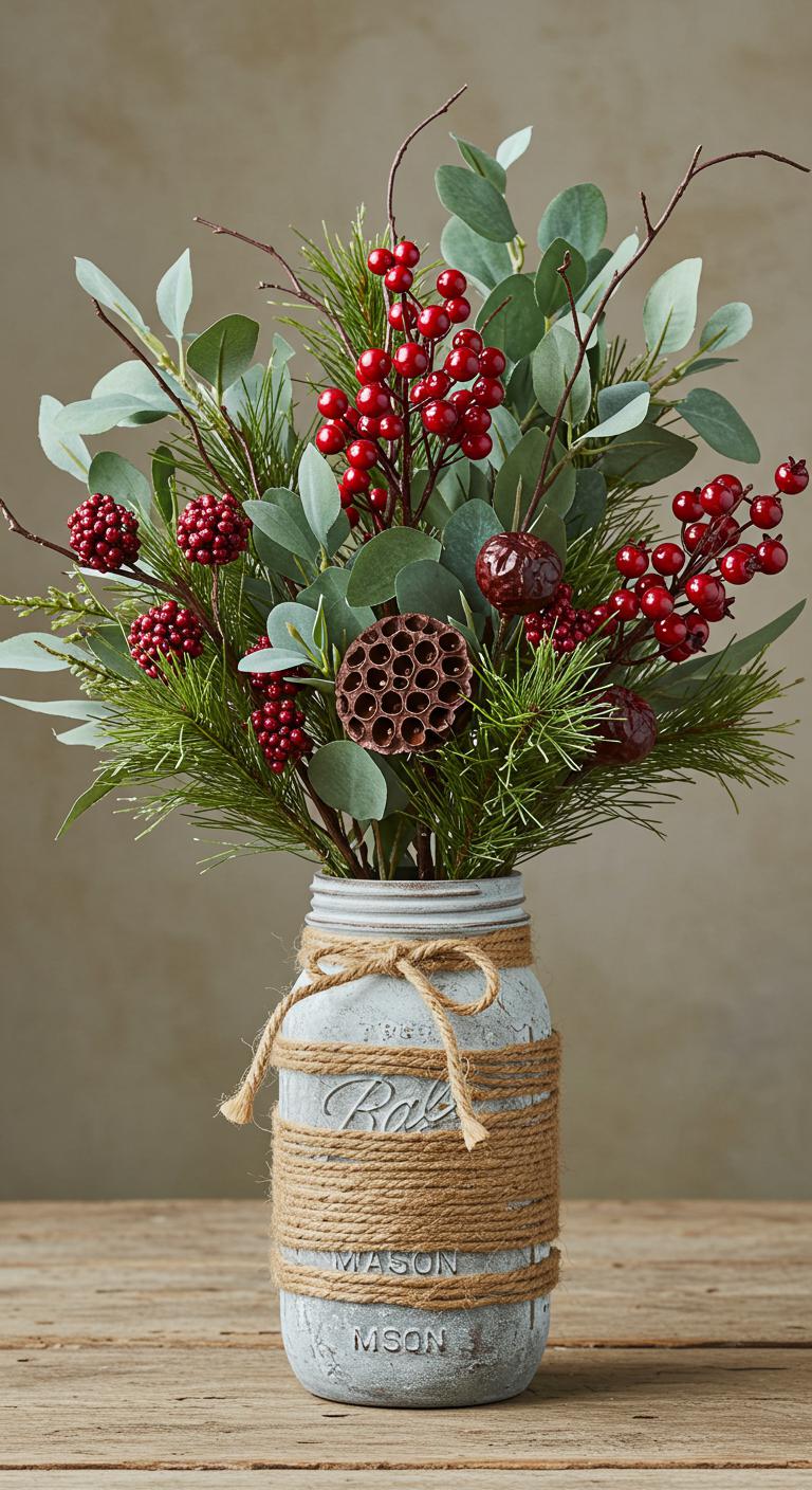 Choose mason jar styles that let stems breathe; mix seasonal berries with seed pods and soft greenery so your arrangement feels wild, free, and unmistakably festive.