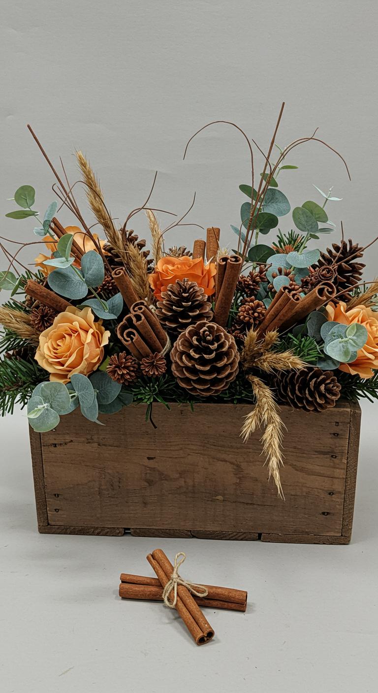 Let stems spill casually, add cinnamon sticks for scent, and place the crate where light makes the colors sing—free, warm, unpolished charm.