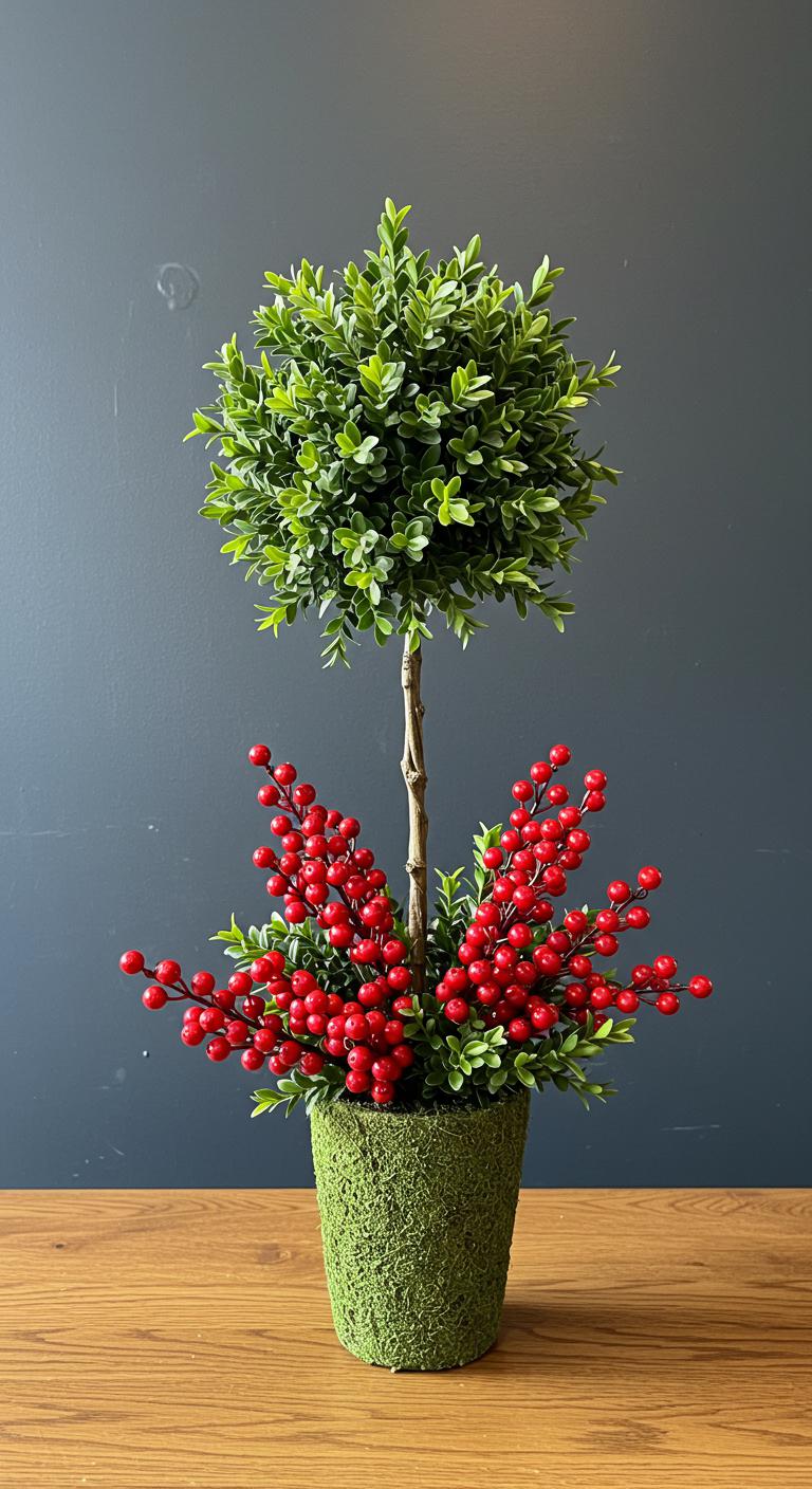 One sprig of boxwood can set the tone for a whole topiary—compact, evergreen, and alive with crisp winter green—while clusters of red berries add the holiday punctuation you’ll notice across a room.