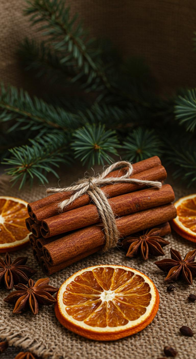 A bundle of cinnamon sticks tied with twine and crowned by dried orange slices turns a corner of your room into a warm, fragrant vignette that feels both rustic and refined.