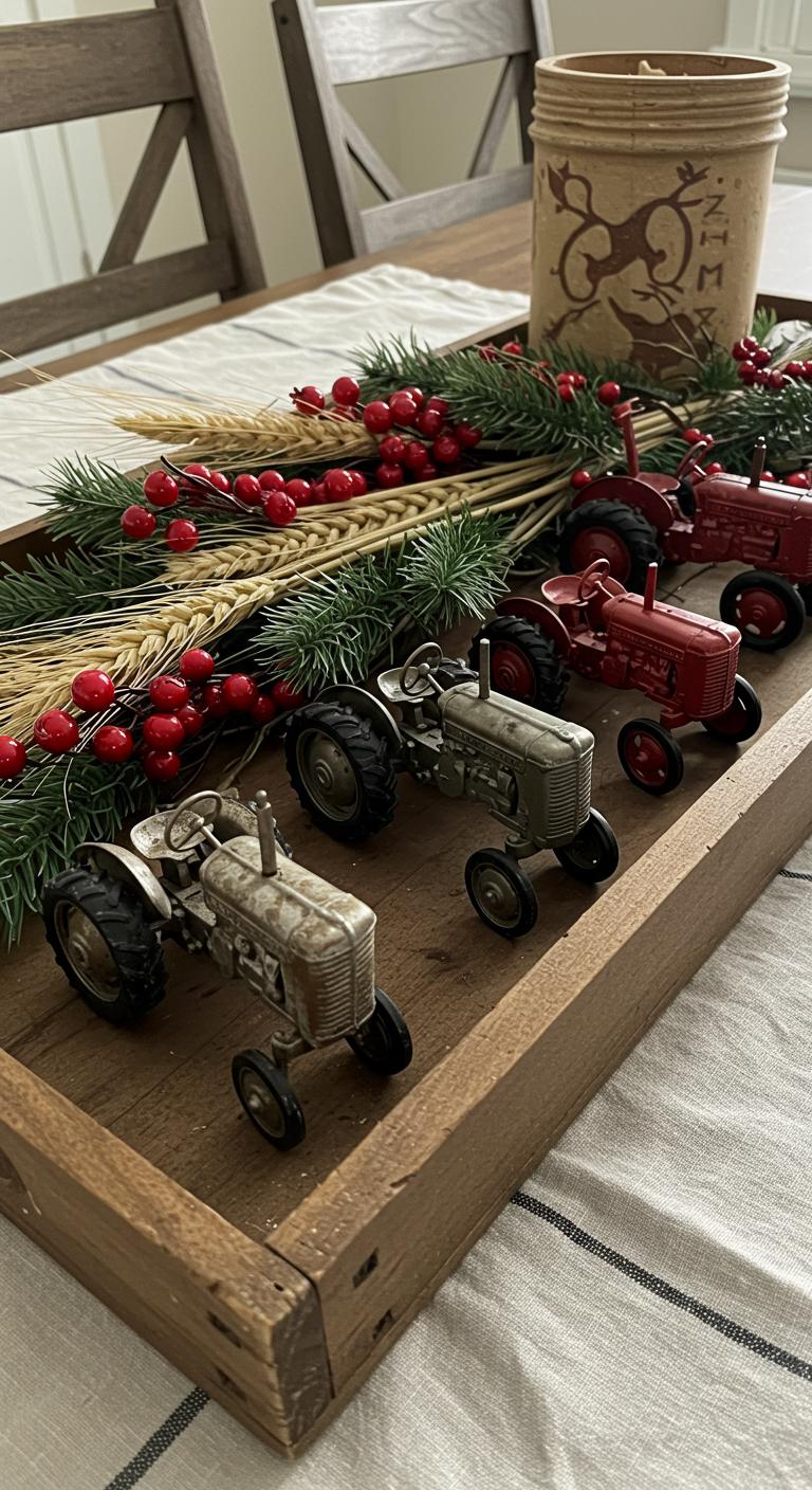 Gather three or five small metal tractors on a weathered wooden tray and you’ll have an instant farmhouse centerpiece that feels both nostalgic and festive.