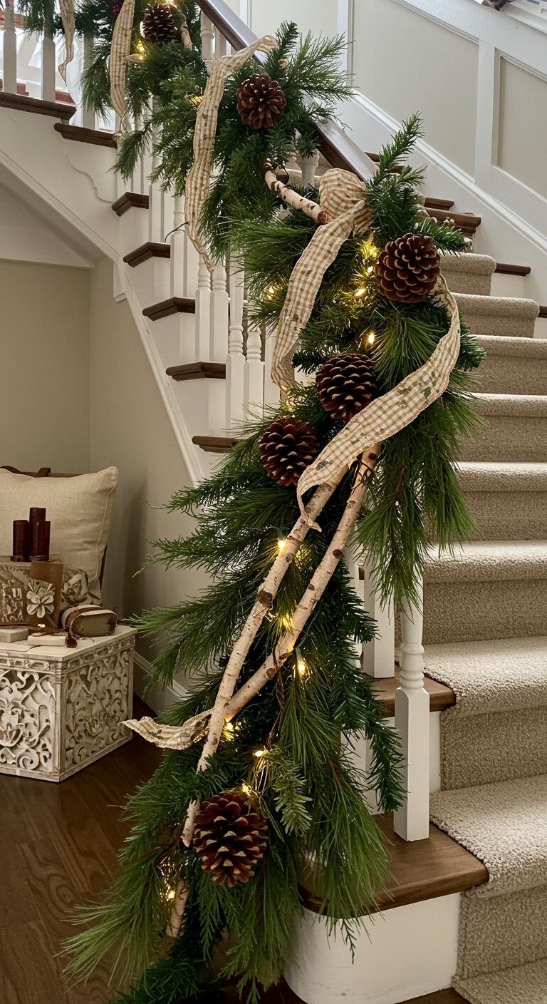 When you drape a garland of fresh evergreen and slender birch twigs along the stair runner, the whole entryway takes on a quiet, wintry hush that still feels warm and lived-in.