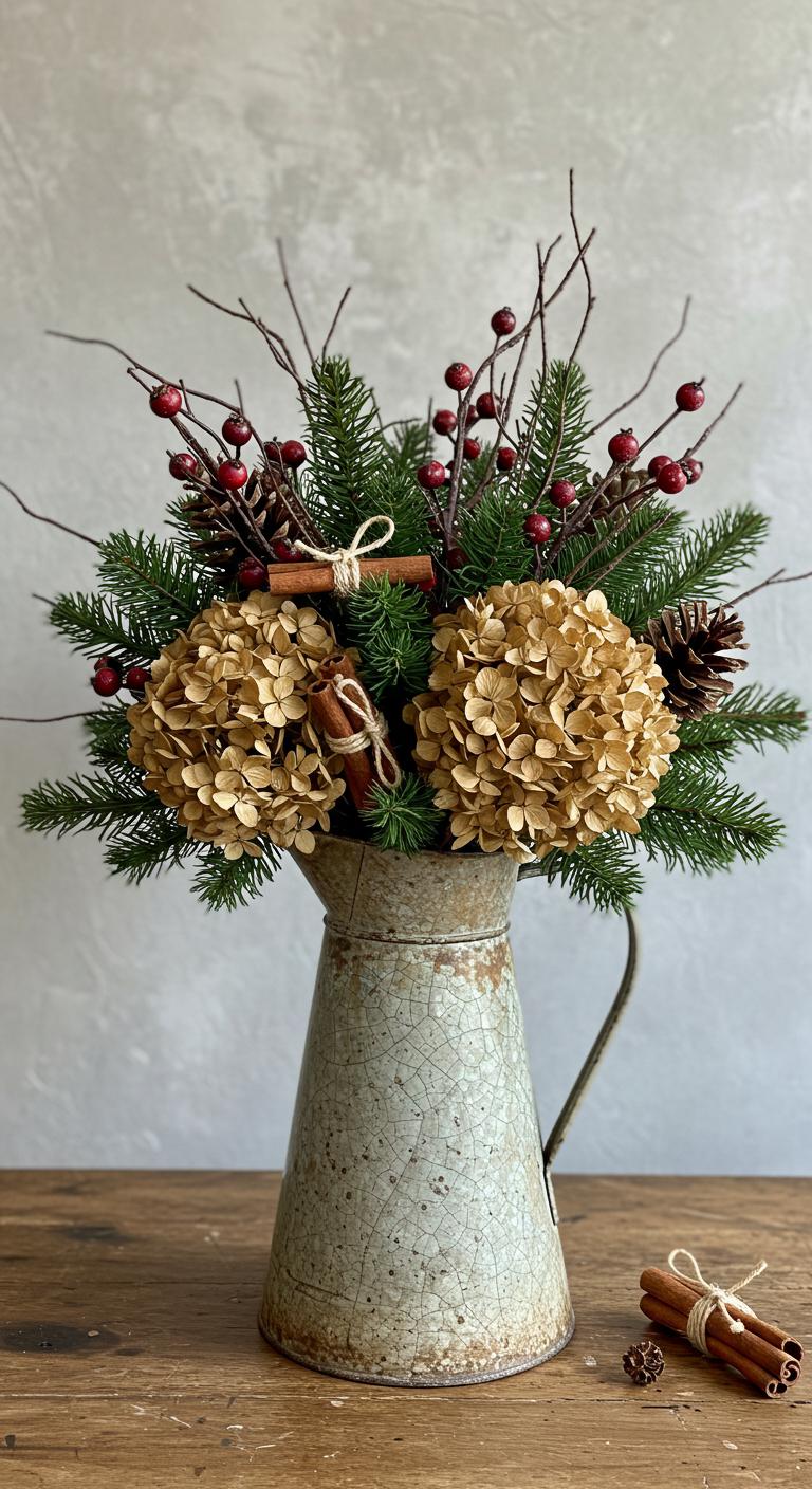 Picture one chipped, weathered pitcher brimming with winter’s best—evergreen sprigs, dried hydrangea heads, berried branches, and a few cinnamon sticks peeking through—so it feels like a found treasure on your holiday table.