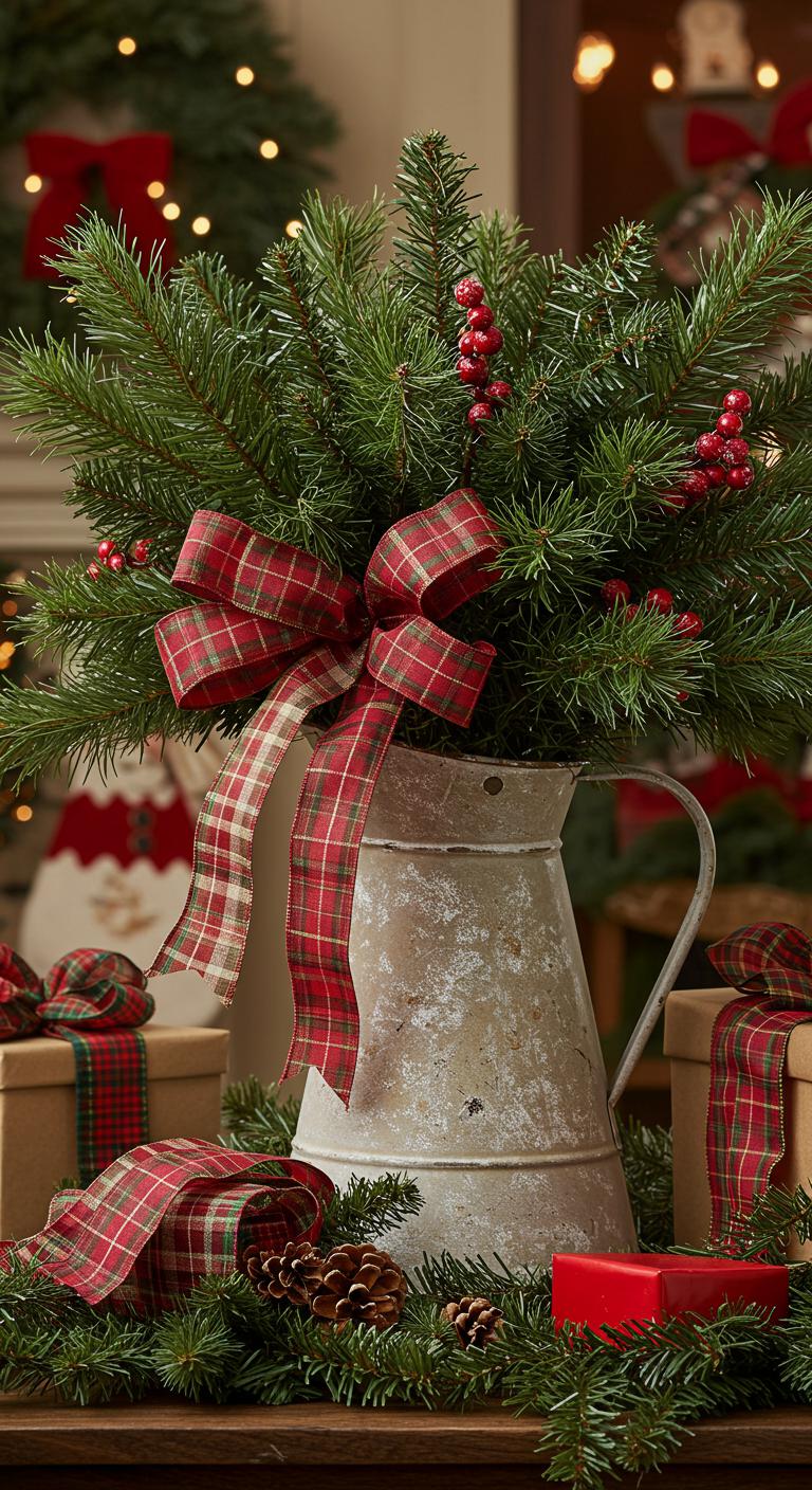 If you loved the weathered-pitcher look, carry that found-charm feeling into a bold Pine Bough and Plaid Ribbon Arrangement that balances rustic ease with festive polish.
