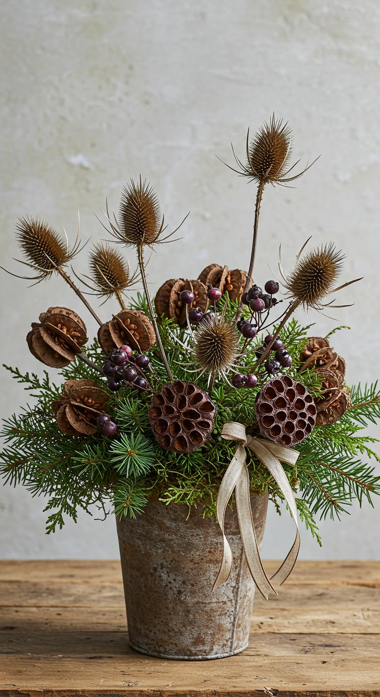 Start with a handful of dried seeded pods and spiky thistles to build a display that feels both wild and deliberately composed; you’ll arrange them in a low, rough-hewn vessel so each stem’s texture and silhouette reads clearly against evergreen sprigs or soft moss.