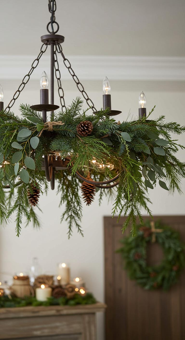 From the grounded, textural feel of seeded pods and thistles, lift your focus upward to a rustic chandelier greenery swag that brings the same wild composure into the room’s overhead plane. You’ll craft a liberated chandelier design using varied greenery types—fir boughs, eucalyptus sprigs, and pinecones—loosely tied with twine. Hang it low, let stems drape, and celebrate seasonal, unfussy elegance.