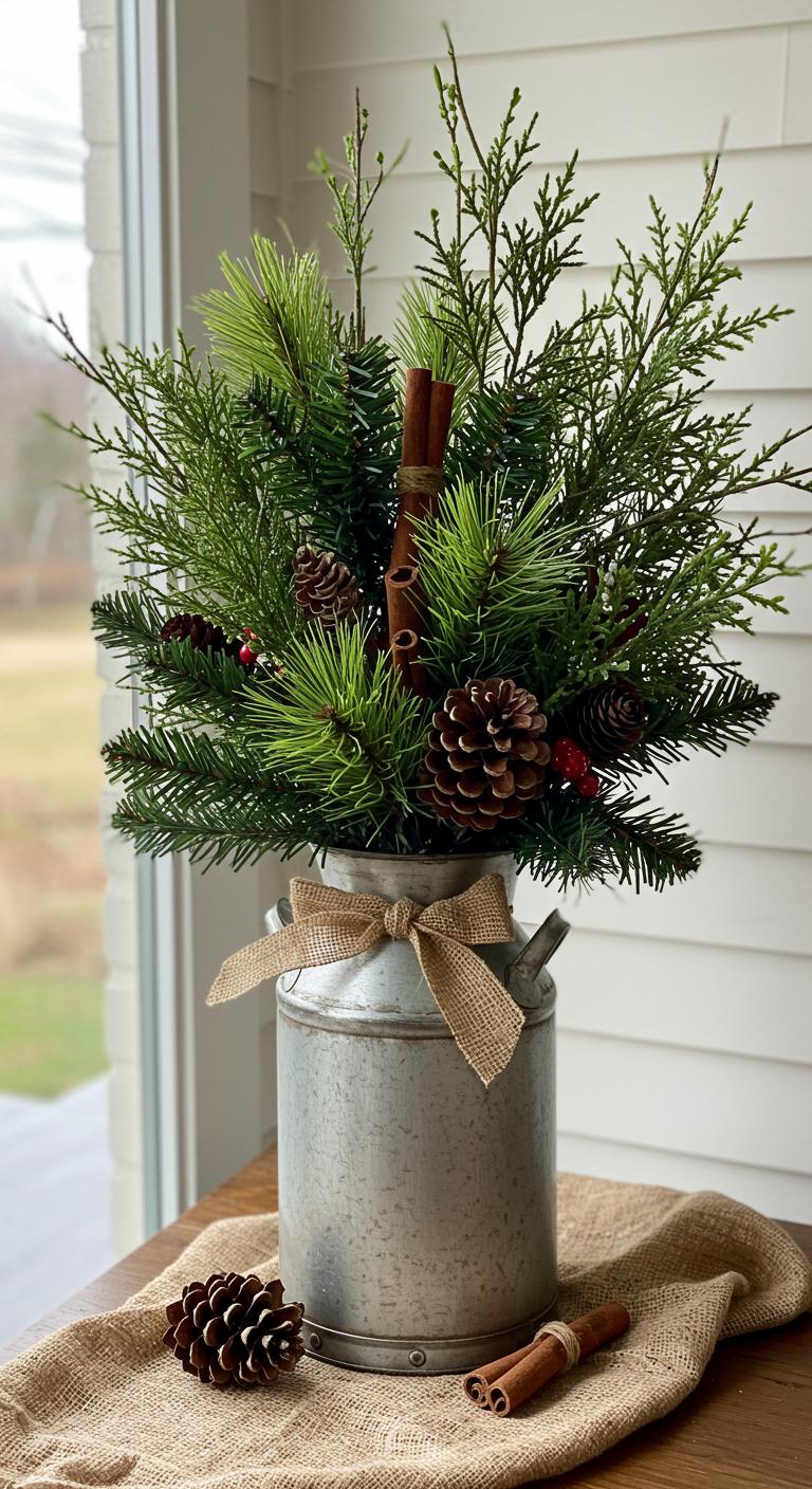 You’ll arrange varied evergreen varieties with pinecones, cinnamon sticks, and a scrap of burlap, creating milk can decor that’s rugged, free-spirited, and thoughtfully balanced for windowsills, porches, or a cozy kitchen table.
