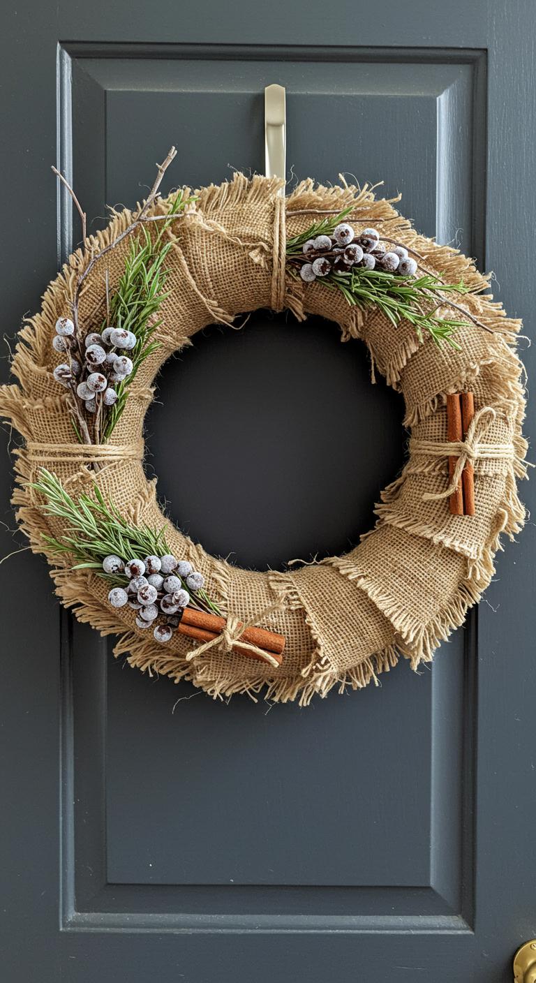 If you want a wreath that feels warm and homespun, wrap a sturdy grapevine base in weathered burlap and let its frayed edges lend a cozy, rustic charm.