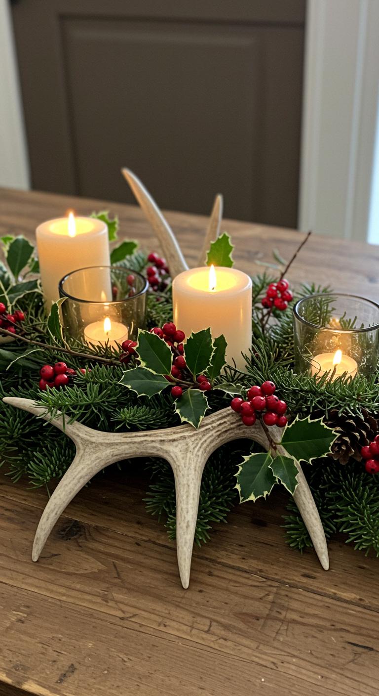 Pair a single shed antler with glossy holly sprigs to create a centerpiece that’s both rugged and festive.
