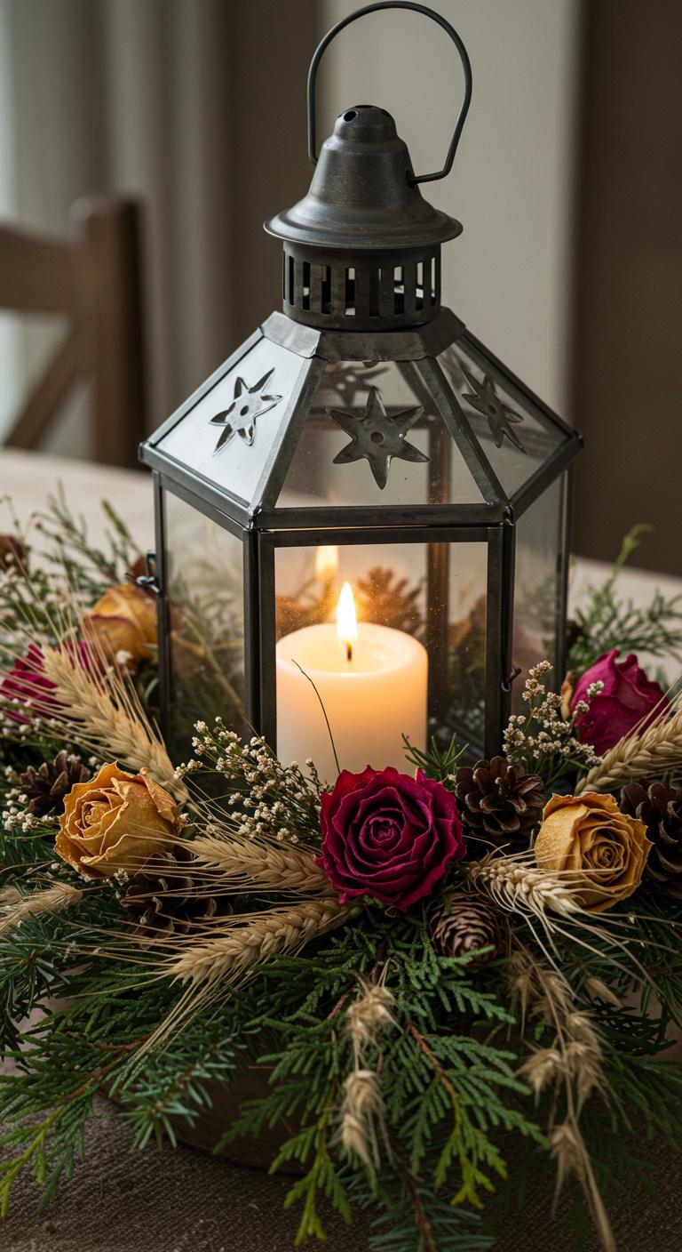 You’ll tuck sprigs of cedar, dried roses and wheat around a glass lantern, letting lantern lighting and candlelight enhance vintage charm.