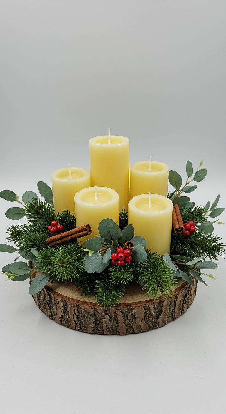 Set a wooden log slice as your warm base and build a low cluster of candles and greenery that feels both rustic and refined. You’ll arrange pine sprigs, eucalyptus, and dried berries around varying pillar heights, letting log slice textures contrast waxy candles. Tuck in cinnamon sticks and sprigs for scent; the candlelight ambiance invites relaxed gatherings and a liberated, seasonal vibe.