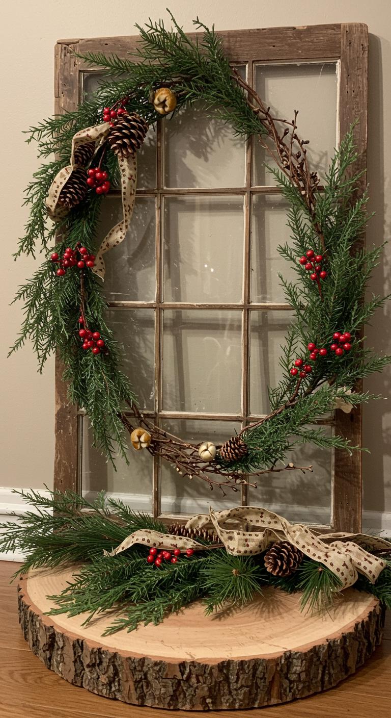 Move your cozy log-slice vignette toward a vertical focal point by leaning a reclaimed barnwood window frame against a mantel or wall and weaving greenery through its panes. You’ll mix pine, cedar sprigs and dried berries, clip loose ribbons, and hang tiny ornaments for a free-spirited touch. These barnwood frame ideas create a warm vintage window display that feels rugged, intimate, and unmistakably seasonal.