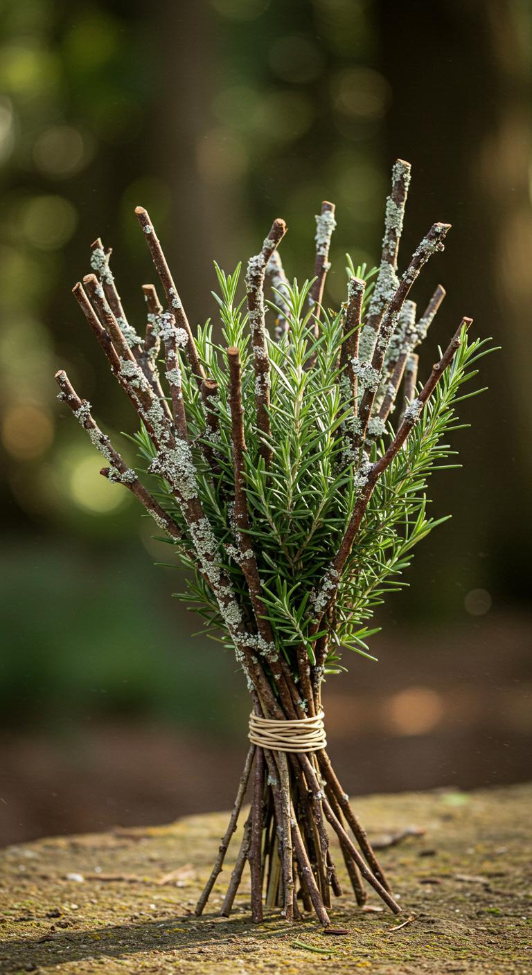 Think of a tiny woodland bouquet you can tuck into nooks and napkins: the twig and rosemary posy pairs slender, lichen-flecked twigs with fragrant rosemary sprigs to create a compact, aromatic accent that reads both rustic and refined.