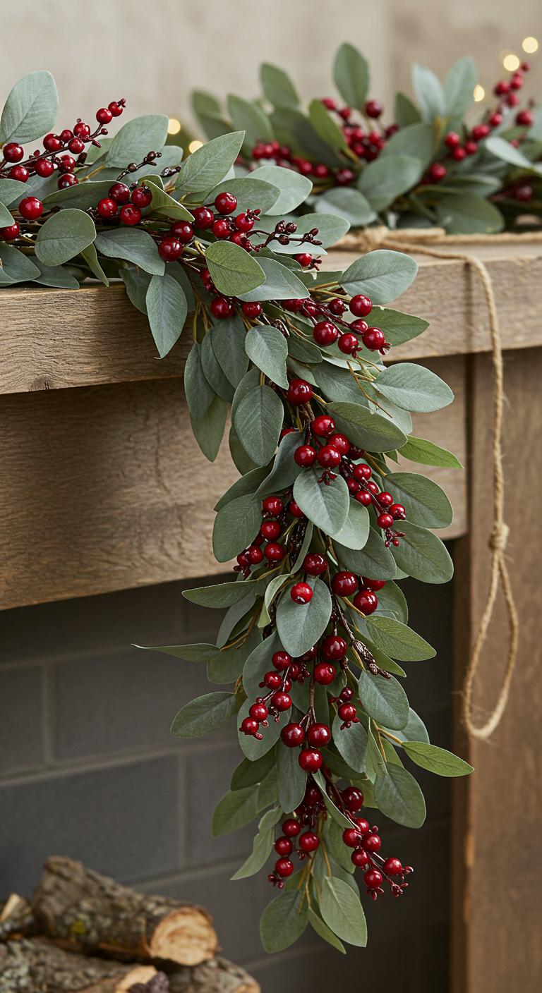 You’ll weave glossy berries for color and cranberry benefits like longevity, pair them with silvery leaves highlighting eucalyptus properties, then drape freely, securing with twine for a liberated, seasonal statement.