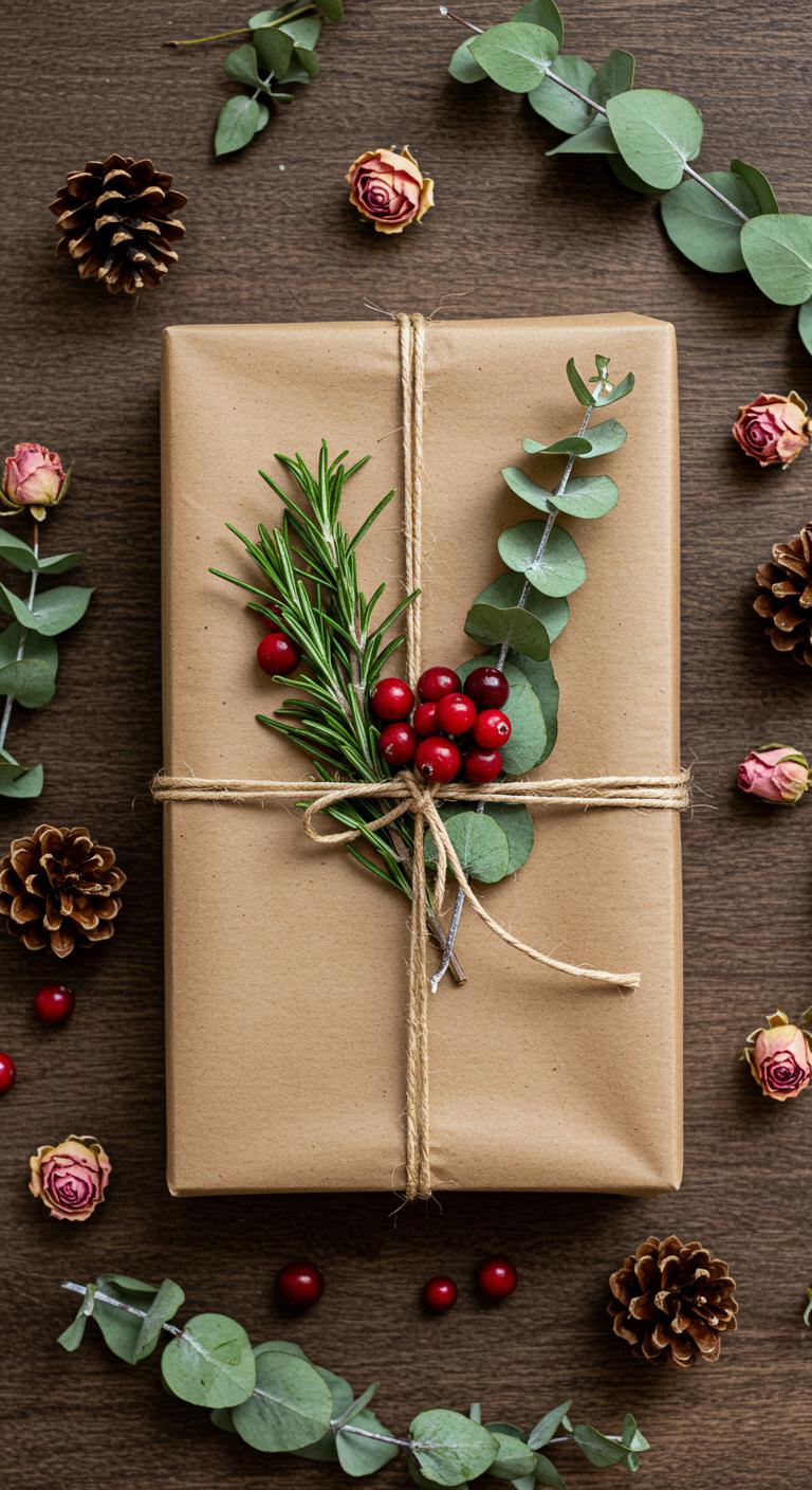 Anyone can turn a simple parcel into a tiny woodland scene by tucking a sprig of rosemary, a cluster of cranberries, or a looped eucalyptus leaf under the twine. You choose minimalist gift wrapping, bold flower selection—dried pinecones, tiny roses, or baby eucalyptus—secure with natural twine, and let seasonal scents roam. Your gifts will feel free, handcrafted, and quietly wild.