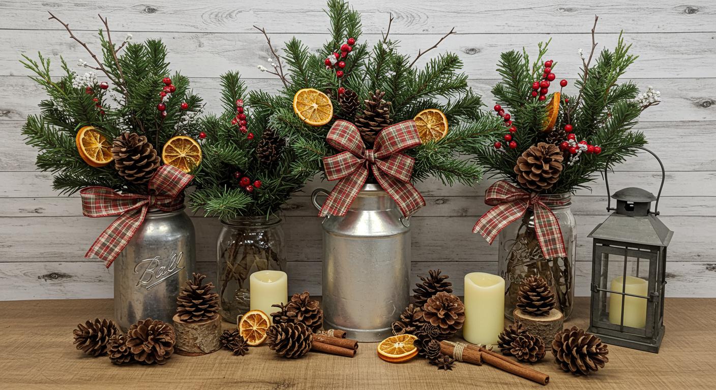 You’ll arrange varied evergreen varieties with pinecones, cinnamon sticks, and a scrap of burlap, creating milk can decor that’s rugged, free-spirited, and thoughtfully balanced for windowsills, porches, or a cozy kitchen table.