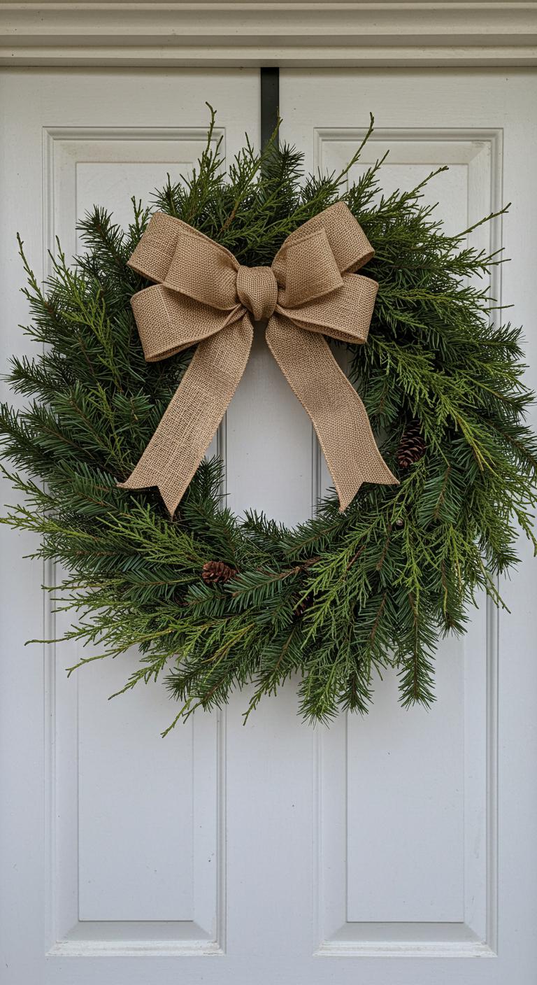 Picture a welcoming circle of fresh evergreens tied with a simple burlap bow — it’s rustic, timeless, and effortlessly chic.