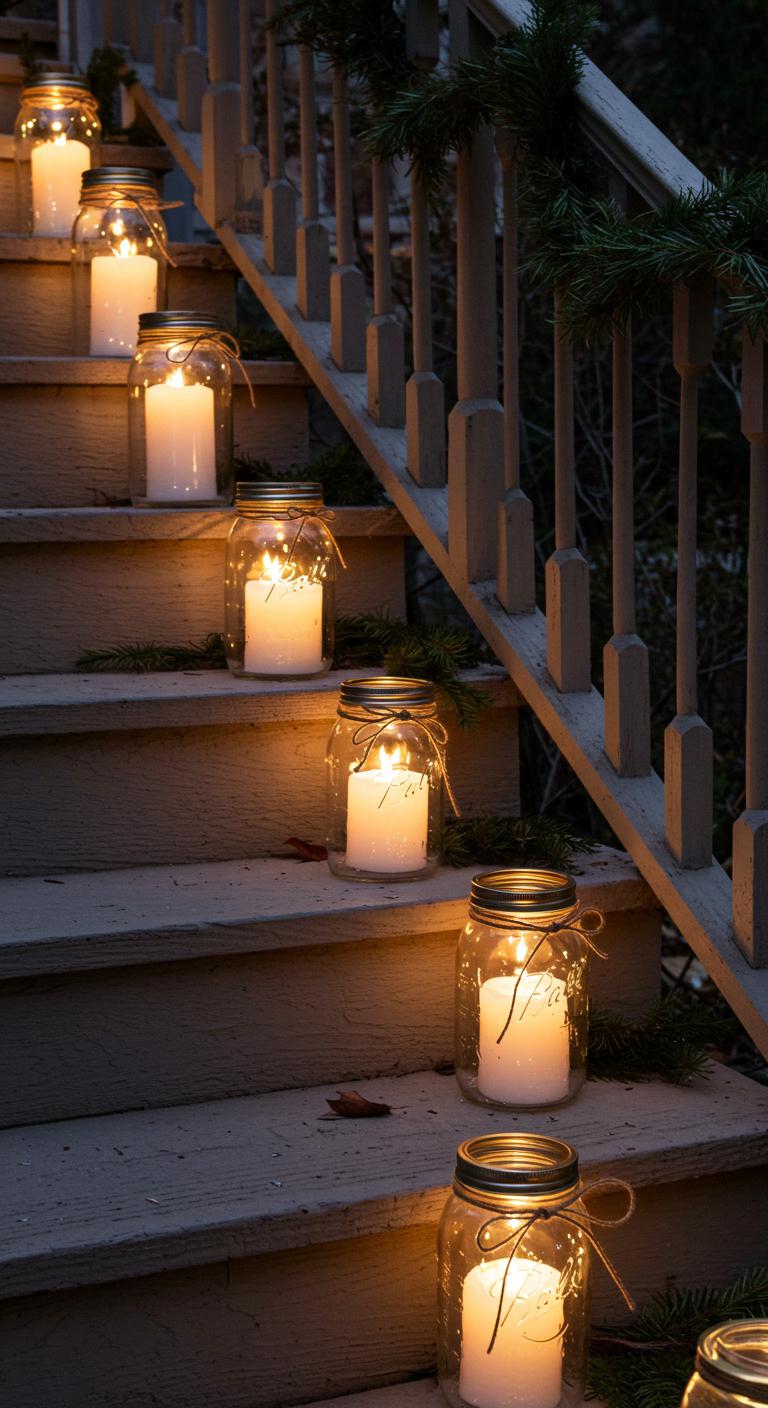 Soft candlelight will guide guests up your steps when you line mason jar lanterns along the risers, creating a cozy, farmhouse-chic path that feels both festive and effortless.
