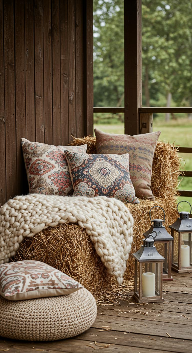 Because rustic charm feels effortless, you can turn a simple hay bale into inviting porch seating by topping it with a thick wool throw and a couple of patterned pillows.