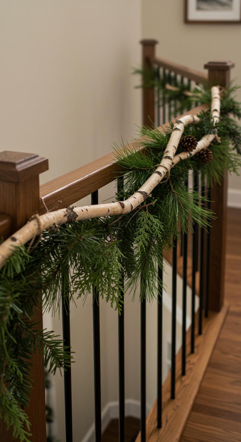 A natural branch garland drapes your railing with effortless woodland charm, mixing pine, birch twigs, and a few evergreen sprigs for texture and scent.