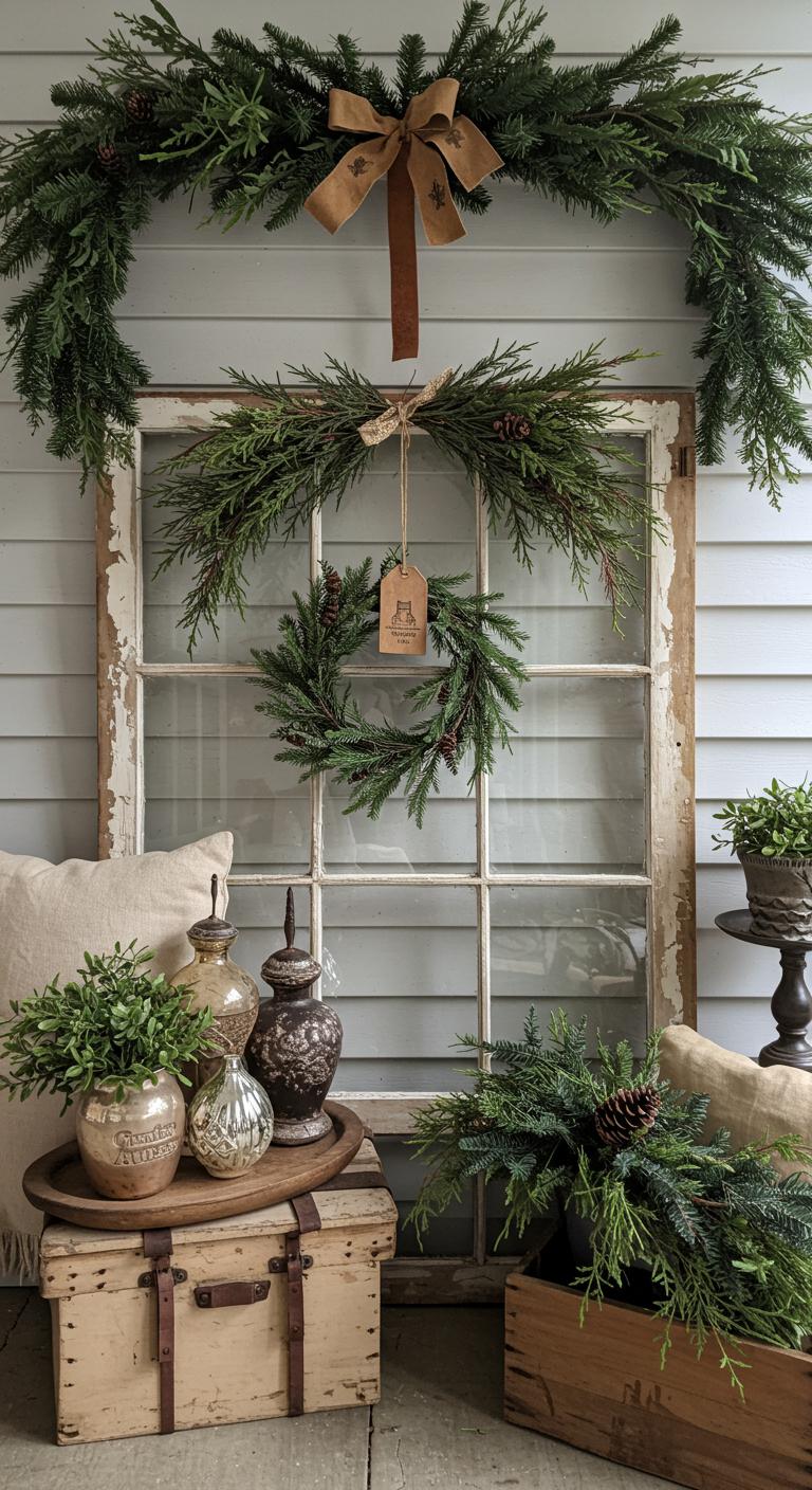 You’ll drape garlands, tuck sprigs into panes, and add vintage embellishments like tarnished ornaments and leather tags.
