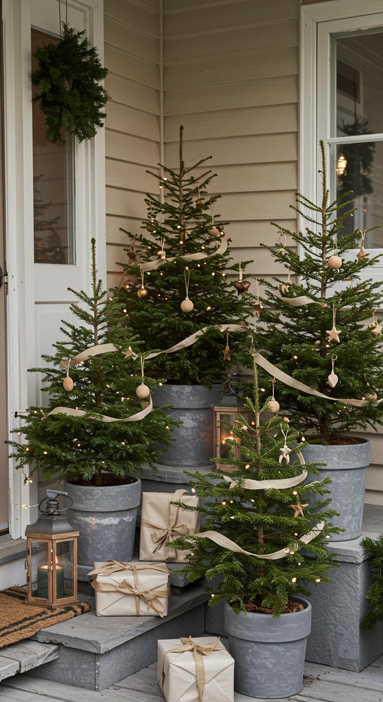 When you tuck potted mini Christmas trees into corners and steps, they bring instant structure and seasonal charm without overwhelming the porch; dress them in a few simple ornaments—matte balls, tiny wooden shapes, or linen ribbons—to keep the look modern and restrained.