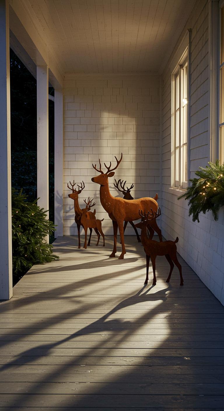 Introduce rustic metal reindeer silhouettes to your porch and they’ll anchor the scene with rugged charm and seasonal whimsy.