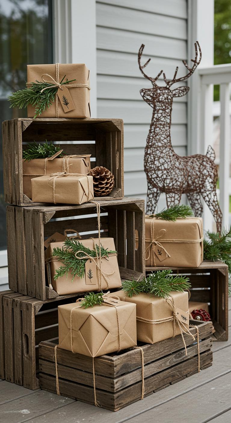 After the metal reindeer set a playful, sculptural tone, stack weathered wooden crates as a complementary focal point that feels both rustic and intentional.