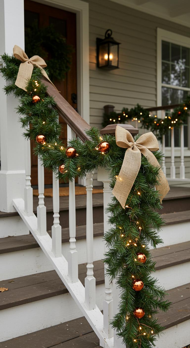 Pine garland wrapped around stair posts instantly anchors your porch in seasonal warmth, its deep green needles and subtle scent creating an inviting arrival.