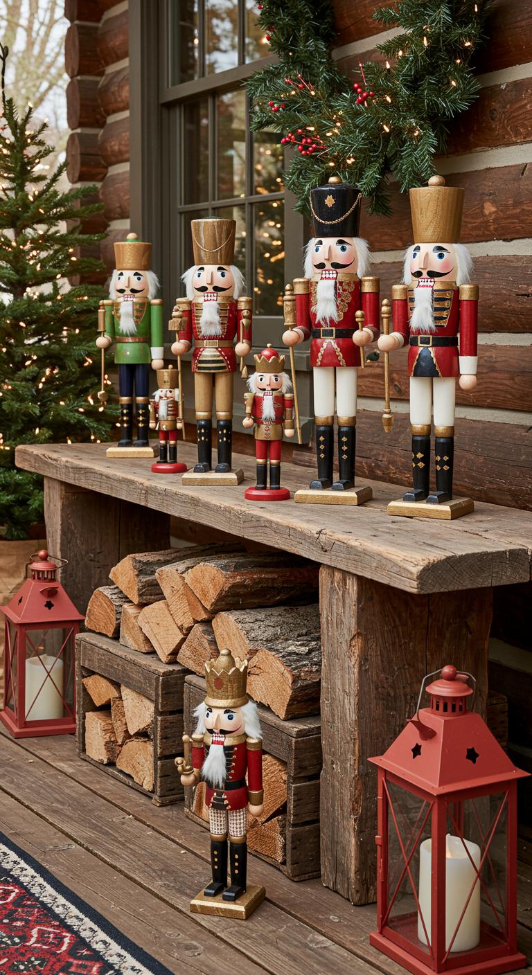 If you want a porch centerpiece that feels both historic and homey, arrange a collection of wooden nutcrackers on a reclaimed log bench or stacked firewood crates to echo a log cabin’s rugged charm.