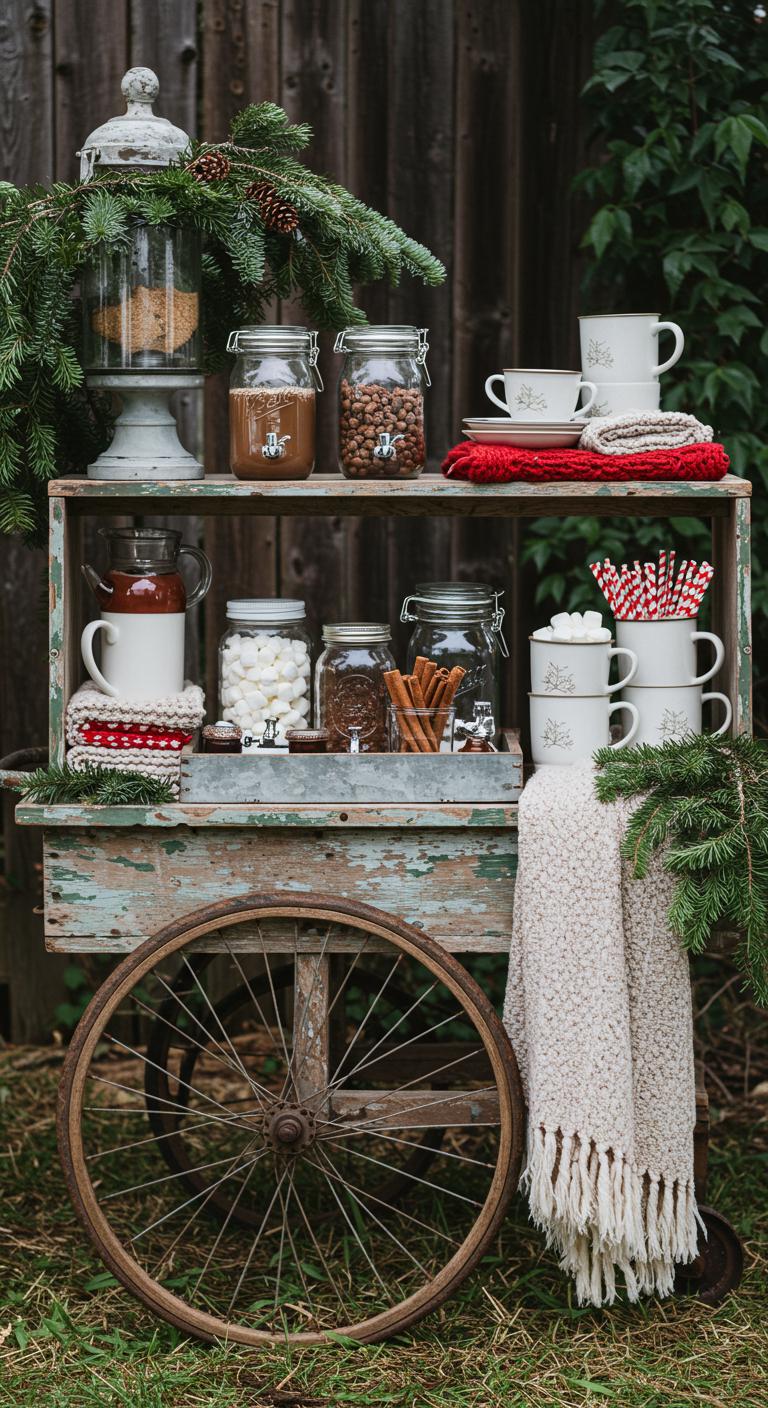 Moving from a nostalgic nutcracker vignette, bring that same cozy charm to a hot cocoa station on a weathered wooden cart—perfect for greeting guests or warming up after a chilly walk.