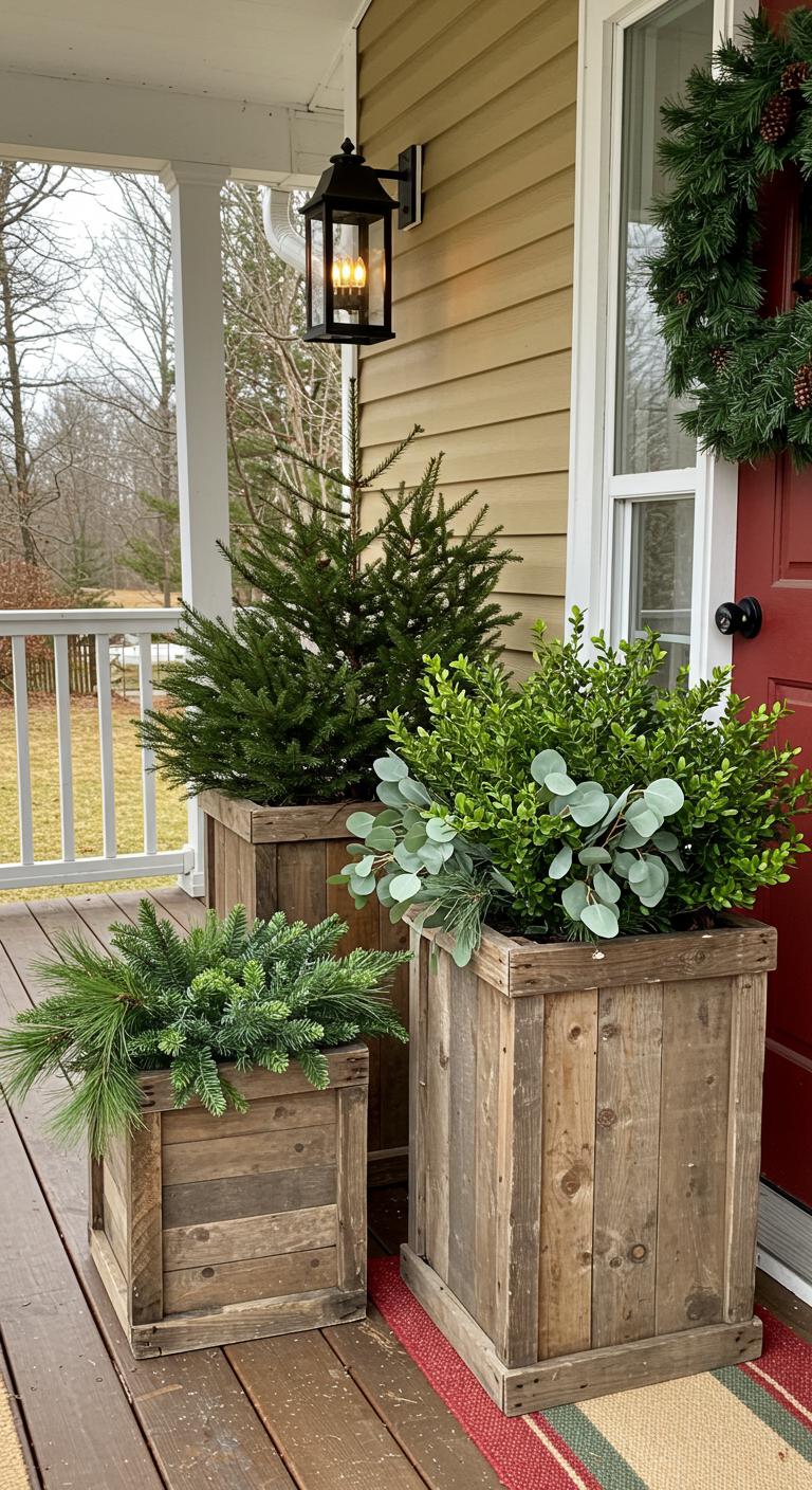 Reclaimed wood planters bring instant character to your porch, their weathered grain and rough edges grounding lush, seasonal greens for a modern-rustic look.