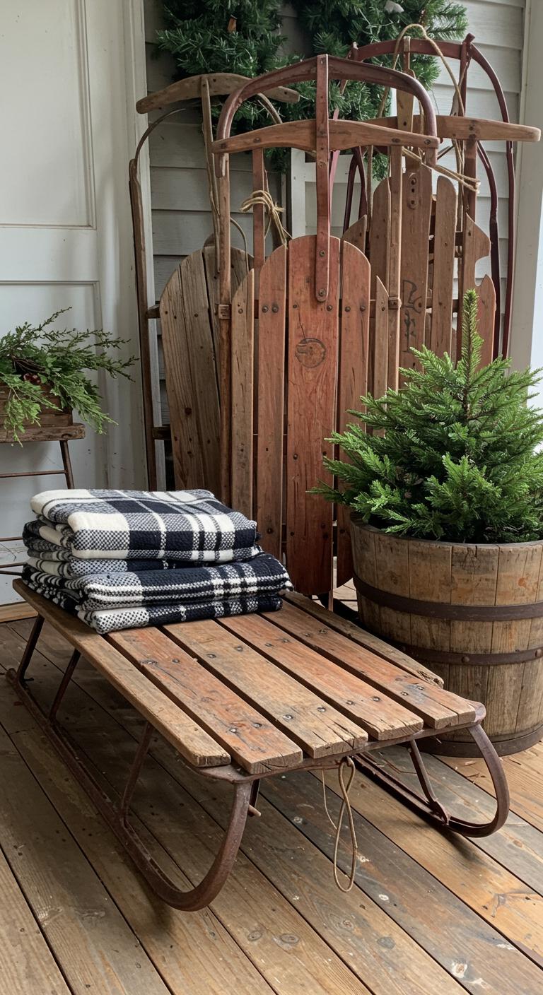 Pair a vintage sled with your reclaimed wood planters to extend that rustic story across the porch—the sled’s patina and worn metal runners echo the planters’ weathered grain while adding vertical interest.