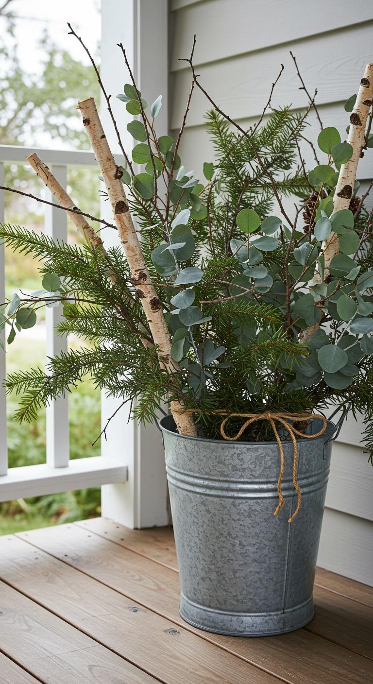 A simple galvanized bucket filled with mixed branches instantly anchors a rustic porch and gives you a fresh, seasonal focal point.