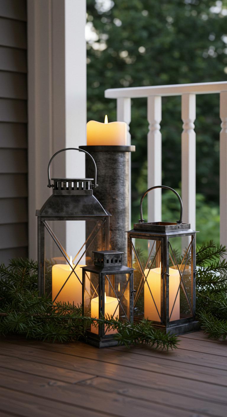 Three or four lanterns clustered with a tall pillar candle make your porch feel like a tiny fireside scene, and they’ll draw guests toward the door with soft, steady light. You’ll mix lantern arrangements in metal and glass, vary pillar heights for rhythm, add sprigs of evergreen, and leave space to move—inviting, modern rustic style that feels free and unfussy.