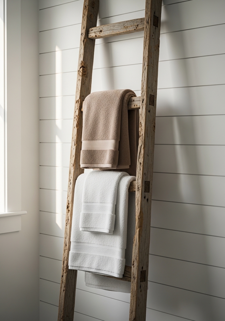 Turn an old wooden ladder into a towel rack for your bathroom – it’s a fresh take on storage that fits the rustic theme perfectly. I crafted one last month using barn wood I found at a flea market, sanding it lightly for that worn-in look. You could paint it white for contrast or leave it natural; either way, it adds height and charm without drilling holes. My guests always ask where I got it, thinking it was store-bought.