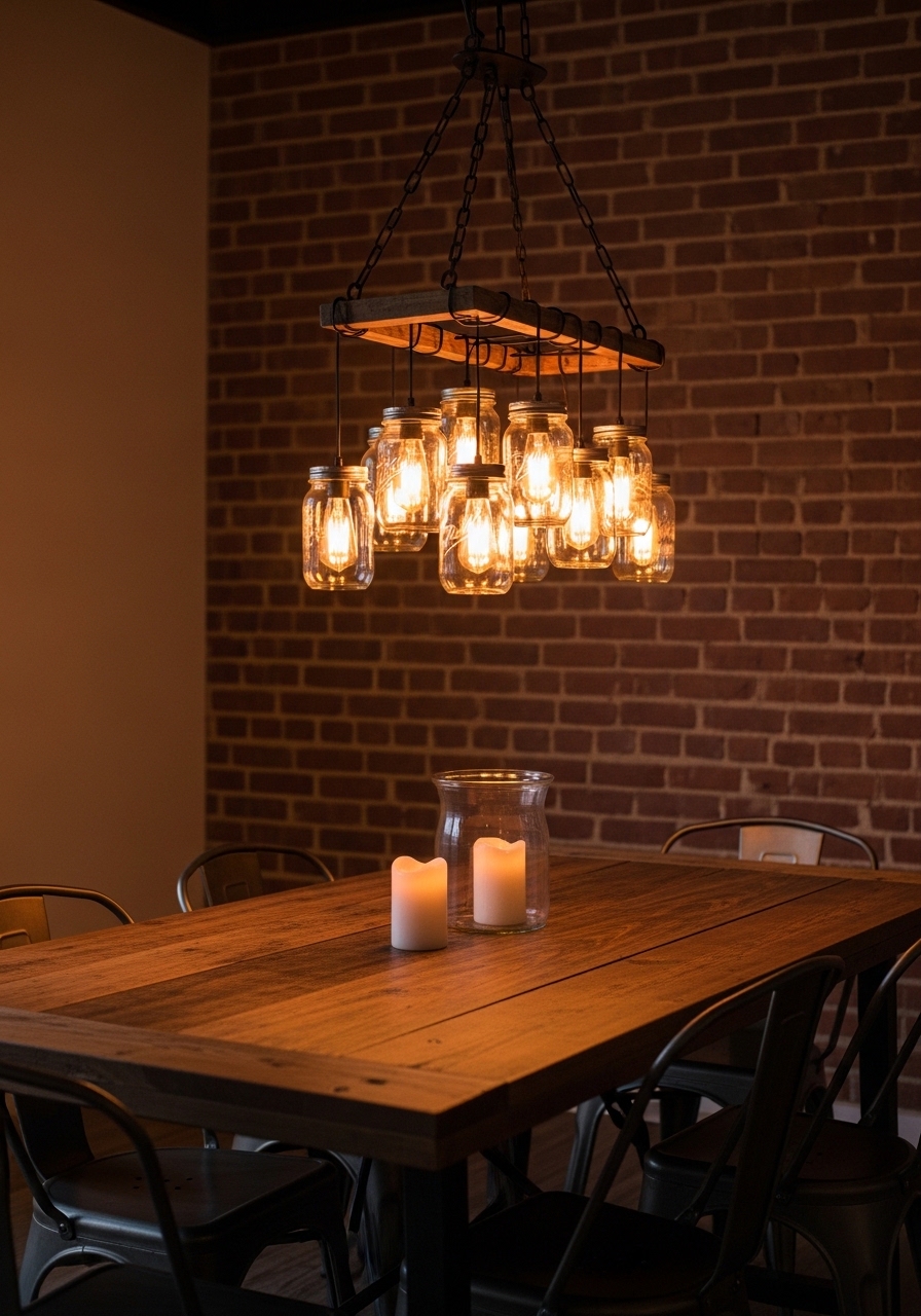 If you’re looking to light up your dining area, try making a chandelier from mason jars and string lights – it’s a unique spin on farmhouse lighting. I hung one in my nook using basic wiring and jars from the pantry, and it casts the coziest glow during evenings. You can customize the jar sizes or add herbs inside for scent. Trust me, it’s easier than it looks and totally transforms the mood.