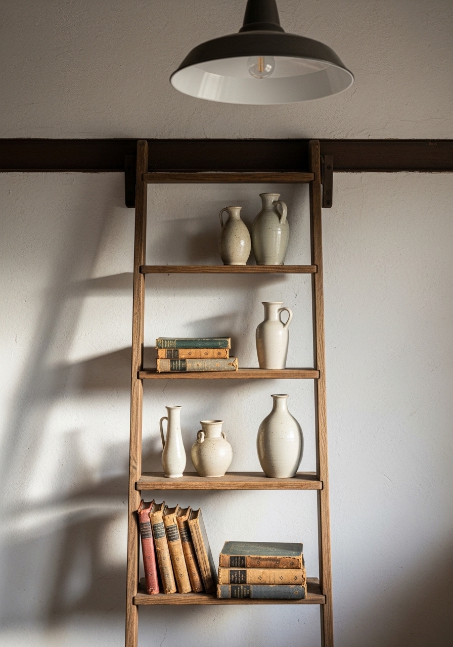 Repurpose a ladder into open shelving for books or decor items. I found an old one at a garage sale, leaned it against the wall, and added planks for shelves. It’s great for small spaces, holding everything from plants to frames. Plus, it’s movable if you change your mind.