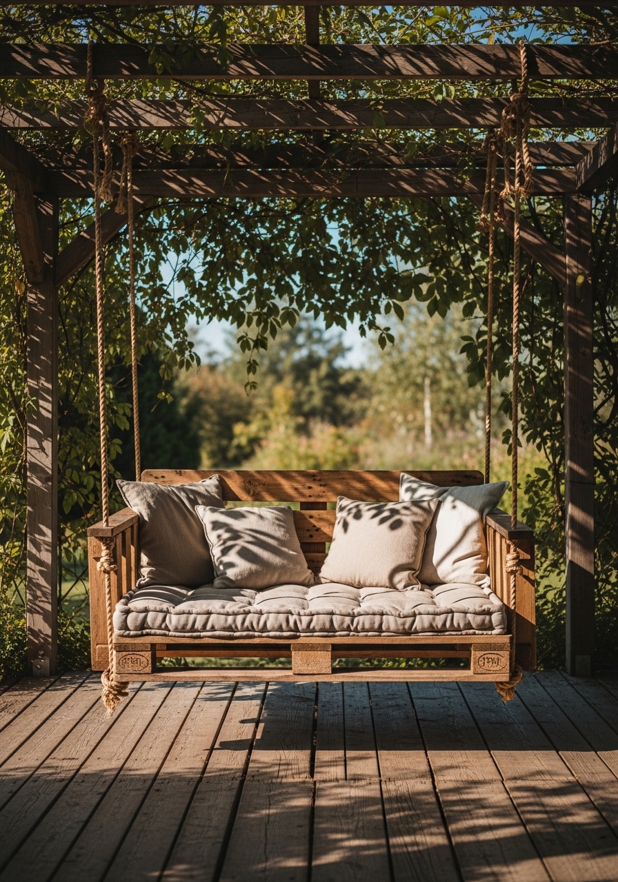 Build a swing from pallets for your porch or yard – it’s a relaxing spot that’s pure farmhouse bliss. I assembled mine with some rope and cushions, and now it’s my go-to reading nook. Sand the wood smooth and seal it for weatherproofing. Friends love swinging on it during barbecues, you know?