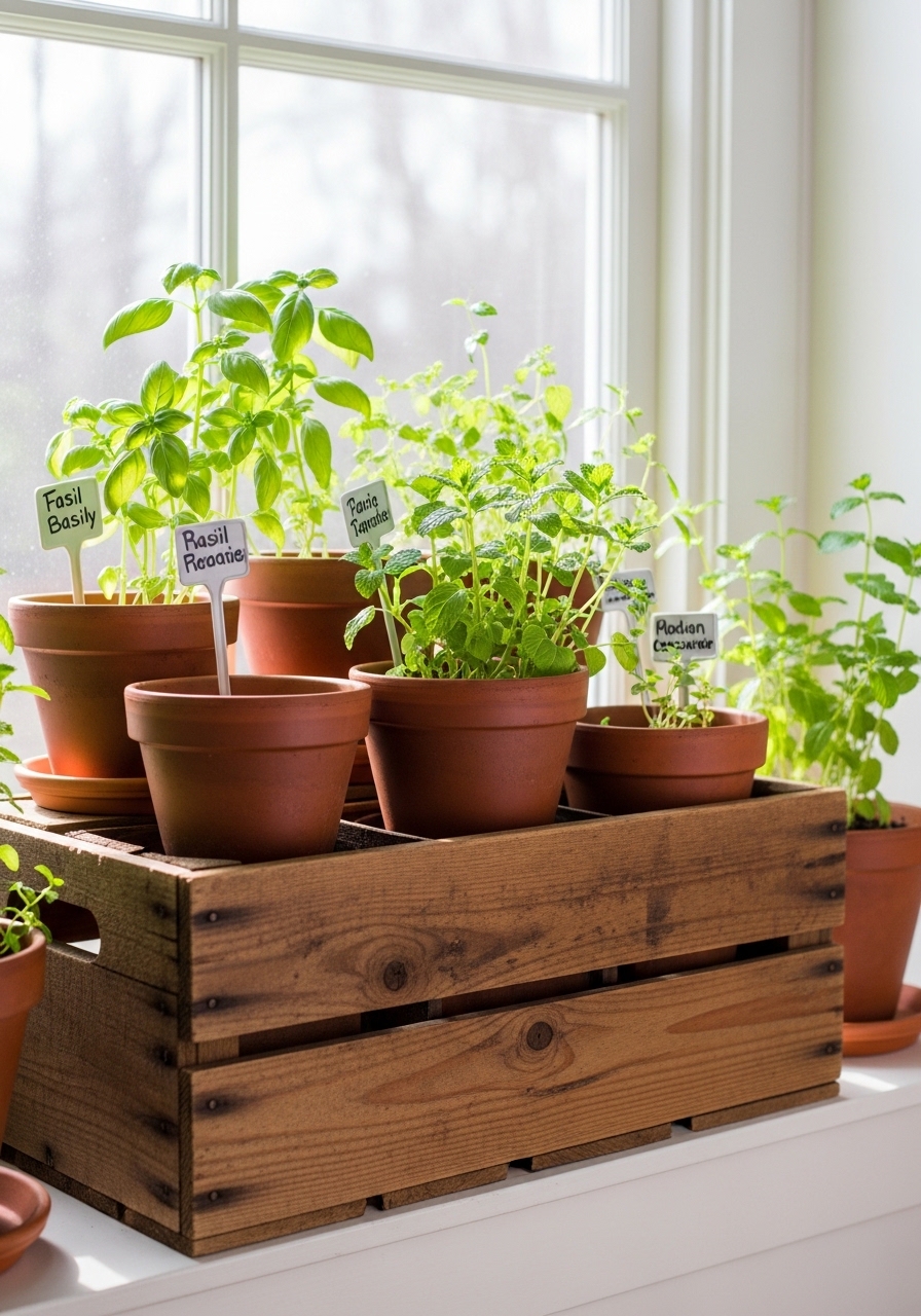 Turn a wooden crate into a mini herb garden for your kitchen window. I planted mine with basil and thyme, labeling pots with chalkboard tags. It’s functional decor that smells amazing while cooking. Super easy to water and maintain, even if you’re not green-thumbed.