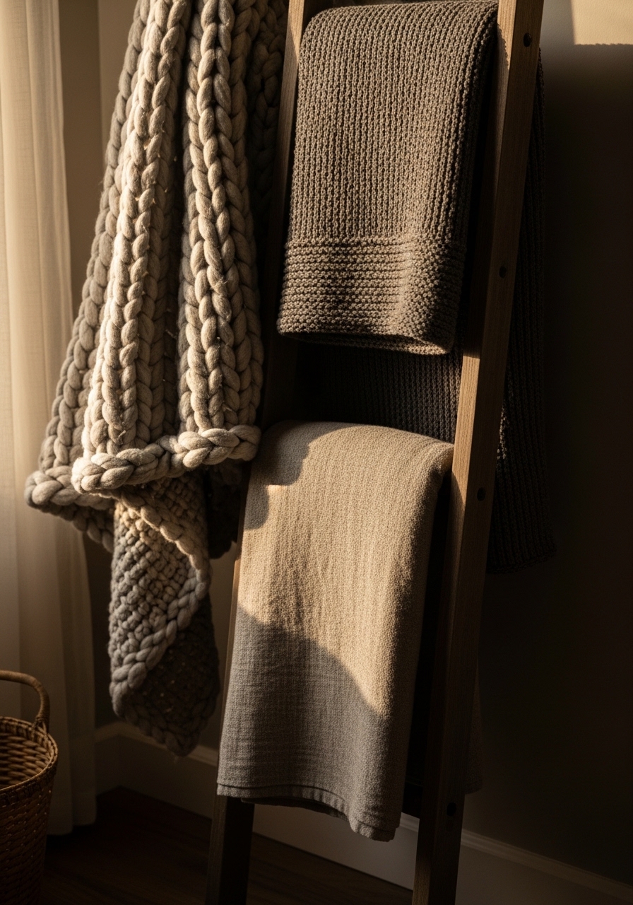 Draping throw blankets over a wooden ladder or armchair invites instant snuggling. I’ve collected a few in neutral tones, and they’re my go-to for chilly evenings. They add softness to the rustic elements and are super easy to swap out. It’s like giving your room a warm embrace without any fuss.