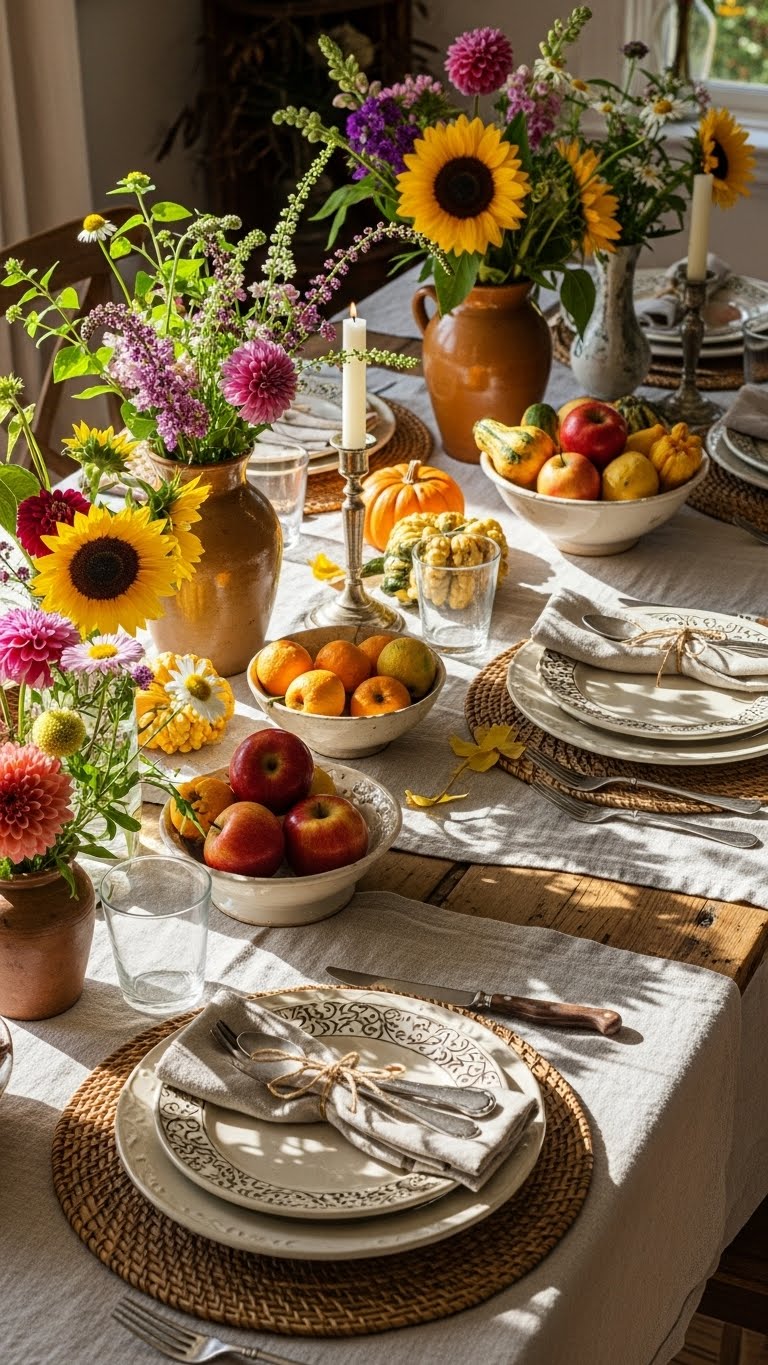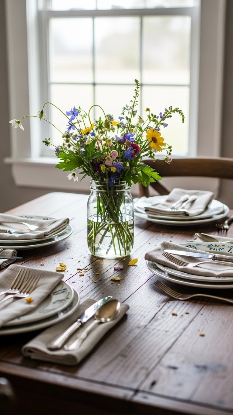 Layer plates and flowers on your table. Use what you have. Center with a jar of blooms. This makes dinners cozy. For DIY, fold napkins creatively.